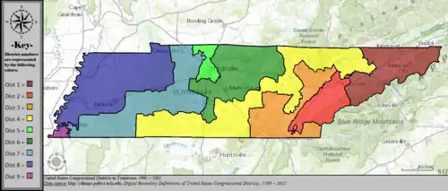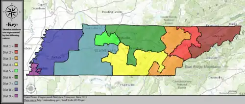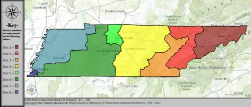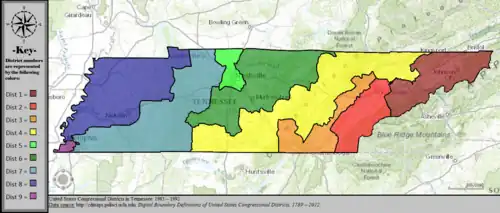 Table of United States congressional district boundary maps in the State of Tennessee, presented chronologically.[5] All redistricting events that took place in Tennessee between 1973 and 2013 are shown.