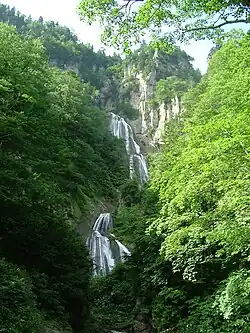 There are waterfalls nearby that attract a number of visitors, for example the 270 meter Hagoromo Waterfall (羽衣の滝, hagoromo no taki) and the Shikishima Waterfall (敷島の滝, shikishima no taki). There are also a number of popular hiking courses nearby.[2] A hiking trail head is located in the village that leads to the Hagoromo Falls, continuing further, hikers will reach another waterfall.[1] There are many hiking trails in the National Park.[3]