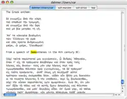 ![]() Terminator on Mac OS X showing live search highlighting and UTF-8 capabilities, courtesy of Markus Kuhn's UTF-8-demo.txt and cat. | |