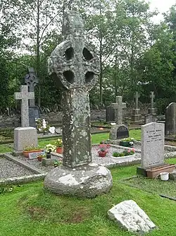 In the graveyard of St. Fechin's Church of Ireland is a high cross with a winged figure above the Crucifixion on the east face, and Christ in Glory on the west face; the rest of the cross is covered in delicate interlacing and geometrical patterns.[8] At the foot of the cross is a slab with a Crucifixion scene (probably 16th-century) and nearby is the base of another cross. Built into the porch of St. Fechin's church is a stone with an inscription that reads 'A prayer for Ultan and Dubthach who made this stone fort'.