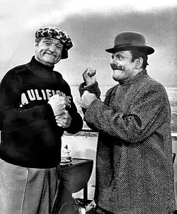 The first of the five films was Brothers in Law, in which Terry-Thomas played the spiv Alfred Green, a performance which was based on Sid Field's characterisation in Piccadilly Hayride.[101] Roy Boulting later recounted that one short scene with Terry-Thomas, Richard Attenborough and Ian Carmichael took 107 takes because of Terry-Thomas's unfamiliarity with filming techniques; he initially struggled to hit his marks, or give his line and move on while still acting. Filming the scene took two days and Boulting described it as a "unique experience for him, and had a wonderful after-effect".[102] Following Brothers in Law he was cast as Romney Carlton-Ricketts in Blue Murder at St Trinian's by producers Frank Launder and Sidney Gilliat,[103] before again appearing for the Boulting brothers in the cameo role of a local policeman in Happy Is the Bride.[104] Terry-Thomas starred in two further films in 1957. The first was as Bertrand Welch in Lucky Jim, an adaptation of the novel of the same name by Kingsley Amis.[105] Although Amis thought Terry-Thomas had been "totally miscast as Bertrand, the posturing painter and leading shit" of the book,[106] the critic for The Manchester Guardian considered Terry-Thomas as being "the nearest to a complete success" in the film, in a portrayal that "suggests possibilities for more serious roles".[107] His final part of 1957 was Lord Henry Mayley in The Naked Truth; this brought him together with Peter Sellers for the first time; the two of them appeared frequently together over the next few years, in scenes in which Graham McCann considered that each actor's performance "highlight[ed] what was special about the other".[108] During one scene Terry-Thomas was dumped in a near-freezing lake, and his health was affected for some time afterwards.[109]