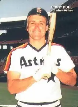 Terry Stephen Puhl (born July 8, 1956) is a Canadian former professional baseball player and coach. He played in Major League Baseball (MLB) as an outfielder from 1977 to 1991, most prominently as a member of the Houston Astros, where he helped the franchise win its first-ever National League West division title and postseason berth in 1980. He also played for the Kansas City Royals.