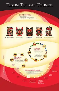 The structure of Teslin Tlingit Council (TTC) incorporates traditional Teslin Tlingit Clan culture into contemporary organizational and management principles. Representation by the five Teslin Tlingit Clans – Kukhhittan, Ishkitan, Yanyedi, Deshitan, and Dakhlawedi – is central to TTC government structure. A member of each Clan sits on the Executive Council, and five representatives appointed by each Clan form the 25-member General Council.