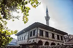 The Alim Bey House is an historic estate in Tetovo. Along with the Saraj in Resen, it is among the more prominent examples of lodgings built by wealthy Ottoman pashas and beys in North Macedonia that were constructed in Western-inspired architecture. The Alim Bey House is an asymmetrical estate built in a neo-Baroque style with decorated façades, ornate friezes, and the use of various geometric shapes including a hexagonal tower. The three-story home is a protected monument of cultural heritage.[39] The building functioned as a hospital until 1993. Renovation works funded by Ministry of Culture of the Republic of Macedonia occurred in 2016.[40]
