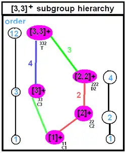 ![]() Td, (*332) [3,3] = | ![]() Octahedral symmetry Oh, (*432) [4,3] = | ![]() Icosahedral symmetry Ih, (*532) [5,3] = | |