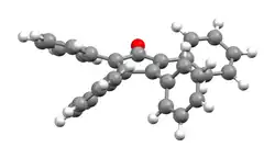 The C5O core of the molecule is planar and conjugated, but the bonds have a definite alternating single- and double-bond nature. The C2–C3 and C4–C5 distances are 1.35 Å, while the C1–C2, C3–C4, C5–C1 are closer to single bonds with distances near 1.50 Å.[1] The phenyl groups of tetraphenylcyclopentadienone adopt a "propeller" shape in its 3D conformation. The four phenyl rings are rotated out of the plane of the central ring because of steric repulsion with each other.[3]