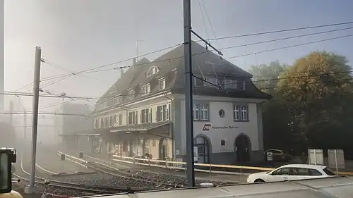 The Teufen AR railway station (German: Bahnhof Teufen) is a railway station in the municipality of Teufen, in the Swiss canton of Appenzell Ausserrhoden. It is located on the 1,000 mm (3 ft 3+3⁄8 in) metre gauge Appenzell–St. Gallen–Trogen line of Appenzell Railways, and is served by local trains only.[2][3] The AR stands for Appenzell Ausserrhoden, to distinguish the station from Freienstein-Teufen in Canton Zurich.
