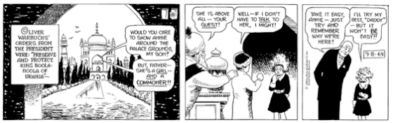 After Harold Gray's death in 1968, Blaisdell stepped in as the artist on Little Orphan Annie, which he continued until 1973, with assists from Paul Kirchner. For Leonard Starr, he handled the backgrounds for Mary Perkins, On Stage.[1] At this time, Blaisdell worked at a studio on the fourth floor at 144 West 57th Street, overlooking dance studios and the rear of Carnegie Hall, a studio space he shared with artists Tom Sawyer and Carl Anderson, letterer Ben Oda, and scriptwriter John Augustin.[4]