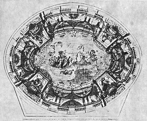 The striking oval ceiling was designed and painted by Charles Séchan, Jules Diéterle and Édouard Desplechin. The scene in the center depicted Apollo on his chariot pulled by four horses, followed by Aurora, the Hours, the Muses, and Arts and Sciences, among others. Two chandeliers were suspended at opposite ends of this central oval, which was unlike most other Parisian theatres, where typically a single chandelier hung from the center of the ceiling and sometimes obstructed views of the stage from the galleries. Surrounding the scene with Apollo were painted in perspective a balustrade topped by a colonnade of double Corinthian columns. The colonnade was interrupted at the midpoints between the vertices by four thrones occupied by the muses of Painting, Comedy, Music, and Tragedy.[9]
