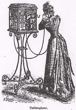 Théâtrophone (French pronunciation: [teatʁɔfɔn], "the theatre phone") was a telephonic distribution system available in portions of Europe that allowed the subscribers to listen to opera and theatre performances over the telephone lines. The théâtrophone evolved from a Clément Ader invention, which was first demonstrated in 1881, in Paris. Subsequently, in 1890, the invention was commercialized by Compagnie du Théâtrophone, which continued to operate until 1932.