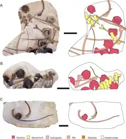 Thirty-three vertebrae of MJML K1885 are extant. The first ten centra have remained articulated, including the atlas-axis. None of the neural arches are fused to the vertebrae, while the neural arches on the main block have the neural spine broken on the dorsal border of the anterior zygapophysis. Some have been slightly displaced by a few millimetres, but most remain articulated, and no chevrons have been preserved.[1]