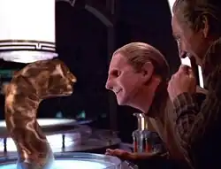 Using Dr. Mora's equipment, Odo employs electric shocks to prod the changeling into holding several basic forms. Both are amazed when the creature imitates the shape of Odo's face. The moment brings Odo and Mora together—especially when Mora admits to Odo that his caring seems to have helped him form a connection with the baby. Mora's support helps Odo to finally forgive Mora for treating him more as a specimen than as a person. He invites Dr. Mora to celebrate their success with a glass of champagne, but the happy mood is shattered when Odo receives word that the creature is dying.