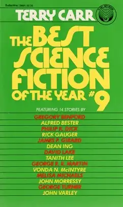 The Best Science Fiction of the Year #9 is an anthology of science fiction short stories edited by Terry Carr, the ninth volume in a series of sixteen. It was first published in paperback by Del Rey Books in August 1980, and in hardcover by Gollancz in October of the same year.