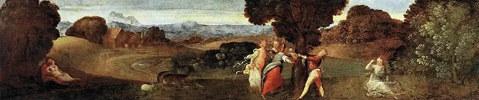 It originated as part of a cassone, which entered its present home as a legacy from Emo Capodilista in 1864. Then attributed to Giorgione, it was later reattributed as an early work by Titian. Some art historians have also suggested an attribution to Romanino. At the centre is a group of figures freeing the child Adonis from his mother, who has just been transformed into a tree. To the left is a pair of lovers (referring to Adonis' conception), whilst on the right is his future lover Venus.[2]