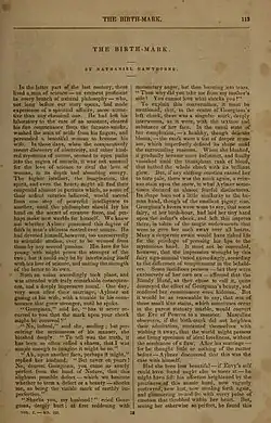 "The Birth-Mark" was first published in the short-lived Boston magazine The Pioneer in its March 1843 issue.[1] That same month, it was also printed in The Pathfinder in New York and, later, collected as part of Mosses from an Old Manse in 1846.[2]