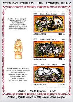 In 1999 the National Bank of Azerbaijan minted gold and silver commemorative coins for the 1,300th anniversary of the epic.[40] The epic culture, folk tales and music of Dede Qorqud has been included in the Representative List of the Intangible Cultural Heritage of Humanity of UNESCO in November 2018.[41]