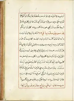 The language of the Gonbad manuscript is of a mixed character and depicts vivid characteristics of the period of transition from later Old Oghuz Turkic to the Early Modern Turkic of Iranian Azerbaijan. However, there are also orthographical, lexical and grammatical structures peculiar to Chaghatai, which shows that the original work was written in the area between the Syr Darya and Anatolia, later rewritten in Safavid Iran in the second half of the 16th century and again in Qajar Iran in the second half of the 18th century.[18] However, the manuscript also boasts a couple of Persian word groups, such as Dāvūd-ı nebī (Prophet Dawud), Şāh-ı merdān ("shah of the valiant", Ali), taḫt-ı Mıṣır (the throne of Egypt) and others.[19]