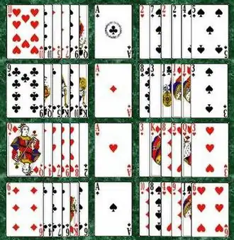 First, the player removes the aces from the deck and aligns them vertically without overlapping them to form the foundations. Then cards are dealt to the left and right of the aces, forming eight rows of six overlapping cards each, in a distinctive tableau layout with wings on either side of the foundations.