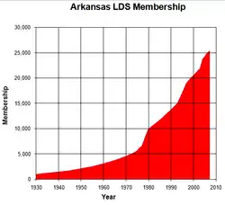 Official church membership as a percentage of general population was 1.00% in 2014. According to the 2014 Pew Forum on Religion & Public Life survey, roughly 1% of Arkansans self-identified most closely with the Church of Jesus Christ of Latter-day Saints.[3] The LDS Church is the 9th largest denomination in Arkansas.[4]