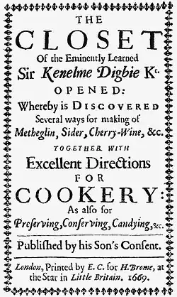 - ^ The complete title is The closet of the eminently learned Sir Kenelm Digbie Kt. opened: Whereby is discovered several ways for making of metheglin, sider, cherry-wine &c. together with excellent directions for cookery: as also for preserving, conserving, candying, &c.