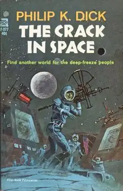 The Crack in Space is a 1966 science fiction novel by American writer Philip K. Dick. In the United Kingdom, it has been published under the title of the original novella, Cantata 140, published in the July 1964 issue of The Magazine of Fantasy & Science Fiction.[1] This original title refers to the short title in English, Sleepers Awake, of J.S. Bach's Cantata BWV 140 and the novel's 'bibs', the millions sleeping in suspended animation. Both are based on the short story Prominent Author.[2] The common elements are the Jiffi-scuttler transport device, the company, Terran Development, that manufactures it (and still exists to play a large role in the later works), and a summary of Prominent Author as an event of the past in chapter 2. The "crack in space" is a defect in Jiffi-scuttler operation that allows access to the Earth (in Prominent Author) and to parallel Earths (in the later works) at various times and locations, beyond its intended use of providing near-instant transport between specific locations on the Earth in the present.