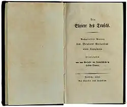 The Devil's Elixirs (German: Die Elixiere des Teufels) is an 1815 novel by E. T. A. Hoffmann. The basic idea for the story was adopted from Matthew Gregory Lewis's novel The Monk, which is itself mentioned in the text. However, his treatment of the story of a fallen Monk was more deeply probing of the human psyche,[1]: 575 and was considered far superior by the German poet and critic, Heinrich Heine.[2]: 81 Story lines in plays by Pedro Calderon and Heinrich von Kleist, which Hoffman directed in 1811, were also influential.[3]: 534–537