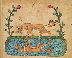 Many Latin versions of the fable also existed and eventually the story became incorporated into mediaeval animal lore. The Aberdeen Bestiary, written and illuminated in England around 1200 (see above), asserts that "If a dog swims across a river carrying a piece of meat or anything of that sort in its mouth, and sees its shadow, it opens its mouth and in hastening to seize the other piece of meat, it loses the one it was carrying".[3]