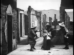 The film has also been mentioned as one of the earliest parodic travelogues.[3] The comic effect is based on the clumsiness of the protagonist and on caricatural stereotypes of European nationalities. Jon Gartenberg has stressed the novelty of the camera movements, in particular the panorama of the waterfront from the departing ship.[4] The caricatural nature of the film has also been stressed by several authors, notably how "Irish stereotypical characters" are depicted during the first stop of the tourists in Europe [5] the way in which "a group of picturesquely dressed locals rob (the protagonist) during his visit to Pompeii",[6] or the energetic massage received at a German bath house.[7]