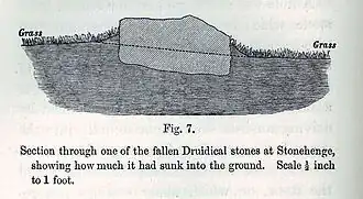 The amount of earth brought to the surface by worms can be estimated by the rate at which objects on the surface are buried and by weighing the earth brought up in a given time. Information from farmers on marl, cinders etc. sinking into the ground allowed Darwin to make calculations. He conducted a 29-year experiment on chalk at a field near his house. Objects of all sorts "work themselves downards" as farmers say. Large stones sink because worms fill up any hollows with castings, then eject them beyond the perimeter and the ground around them starts to rise. He visited Stonehenge and found some outer stones partly buried, the turf sloping up to meet them (see figure 7). Darwin weighed castings and had friends do so in other countries. He also weighed castings per unit area per year, then worked out how thick a layer castings would make, compared with rates of sinking. Additionally, he worked out casting weight per worm per year.