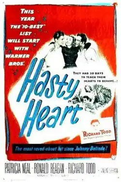The Hasty Heart is a 1949 war drama film, an Anglo-American co-production starring Ronald Reagan, Patricia Neal, and Richard Todd and directed by Vincent Sherman. The film is based on the 1945 play of the same name by John Patrick.