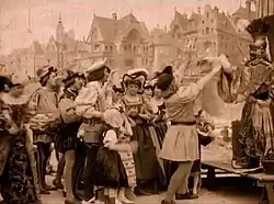 2. A stage set representing a mediaeval city with a crowd of people in front of the city gate. A couple of thieves are robbing people. The camera pans right to a stage where a magician is performing tricks. He then puts a white hen into a lottery. The wheel turns and the lucky winner take the bird away. The camera pans left to follow him as he walks towards the city gate and exits.
