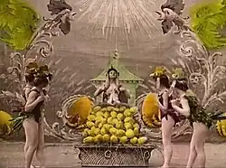 The film was directed by Gaston Velle on a scenario, inspired by Jean de La Fontaine's eponymous fable, by Segundo de Chomón,[3] who was also responsible for the cinematography.[4] It was released in December 1905 in France, Denmark and United States. On 4 February 1906, the Journal d'Indre et Loire wrote: "La Poule aux œufs d'or (The Hen with the Golden Eggs), the magnificence of which particularly amazed the public as much by the interest of the scenario as by the ingenuity of a staging that the best engineered and most modern theatres would not disavow."[5]