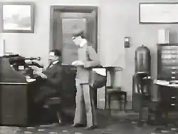 Company records also credit the filming of this short to Wilhelm ("Billy") Bitzer, who had begun working as a staff cinematographer for Biograph in 1896 and by 1908 was widely regarded "as the greatest camera man in the business".[10][11] It is noteworthy that the actor portraying the "Mailman" in the opening scene of The Invisible Fluid is D.W. Griffith, who is wearing a postal uniform and carries a letter bag on his shoulder.[1] Just weeks after the filming of this project, Griffith would broaden his duties at Biograph and make his debut as a film director, overseeing the studio's production of the drama short The Adventures of Dollie.[12] Although another company cinematographer, Arthur Marvin, shot that 1908 release, Griffith would soon begin collaborating with Bitzer, who served not only as his chief cameraman on nearly all of Griffith's future projects but also served as Griffith's early mentor, instructing "the novice director" about many aspects of film lighting, scene composition, and editing.[13][14]
