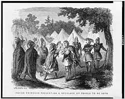 Initially, the Lady of Cofitachequi's plan was to form diplomatic alliances with the Spaniards. However, after realizing that the Spanish threatened to rob most of her chiefdom's food supplies, natural resources, and precious metals, she decided to disappear. Her hopes were that in her absence and without guidance, De Soto would be forced to leave her kingdom. However, DeSoto and his men traveled to the town of Talimeco where the Lady's house was located along with her temple which one Spaniard described as "among the grandest and most wonderful of all the things he had seen in the New World."[5] The Spaniards looted the temple taking with them large quantities of pearls and animal skins.[6] Eventually, De Soto managed to locate and to take as captive the Lady of Cofitachequi.[7]