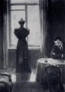 Returning to Moscow, to his loveless marriage and his daily routine, working by day and socializing by night, Gurov expects to soon forget young Anna, but to his surprise, her memory haunts him. Unexpectedly, he falls deeply in love for the first time, after many affairs and just as he is approaching middle age. He feels that he must see Anna, despite the obvious complications. On the ruse of going to St. Petersburg to attend to personal business, he sets off to Anna's hometown to find her. Learning the location of the family's residence from a hotel porter, he finds the house, only to realize that it would be unwise to intrude. In despair, he rationalizes that Anna has probably forgotten him and found someone else, and heads back to his hotel.