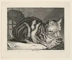 The Large Cat, also known as Cat Sleeping, is a 1657 engraving by Dutch artist Cornelis Visscher (1629-1658). Two states are known. It measures 14.3 cm × 18.7 cm (5.6 in × 7.4 in).