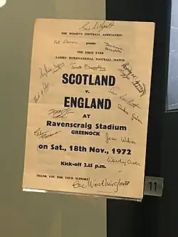 Following a UEFA recommendation in 1972 for national associations to incorporate the women's game, the Football Association (FA) later that year rescinded its ban on women playing on English Football League grounds.[8][9] Shortly after, Eric Worthington was tasked by the WFA to assemble an official women's national team. England competed in its first international match against Scotland in Greenock on 18 November 1972, 100 years to the month after the first men's international.[4][10] The team overturned a two-goal deficit to defeat their northern opponents 3–2, with Sylvia Gore scoring England's first international goal.[11] Pat Firth scored a hat-trick in an international against Scotland in 1973 among the 8–0 scoreline.[12] Tom Tranter replaced Worthington as long term manager of the women's national football team and remained in that position for the next six years.[5]: 94