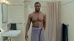 The ad expanded upon the first commercial, which featured two changes of location, and only one on camera (the bathroom "set" lifting away).[3] In "Questions", there were more frequent changes of location with more extravagant transitions. Mustafa begins at a shower station on the beach. The scenery splits in half (as do false legs and a towel) and pulls away to reveal Mustafa log rolling before he walks across the surface of a lake (catching a falling cake mid-stride) into a kitchen (power-sawing a countertop mid-stride) to the top of a waterfall, which he "swan dives" off into a hot tub, which then collapses to reveal that Mustafa is sitting on a motorcycle, his shorts having been replaced by jeans. He performs the entire commercial without breaking eye contact with the camera, while addressing female viewers and asking rhetorical questions on what they like, implying that if their man used Old Spice, then he could bring them these things.[11]