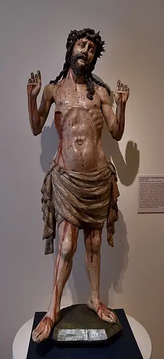 The Man of Sorrows from the New Town Hall in Prague (1413-1419?) is a painted polychrome statue in wood, attributed to the Master of the Týn Calvary. The statues of the Man of Sorrows from the Old Town Hall and the New Town Hall in Prague are the oldest extant works of this type in the Czech lands. The statue in the Council Chamber of the New Town Hall survived the defenestration of councillors by radical Hussites in 1419. It is displayed in the historical exhibition of the City of Prague Museum.