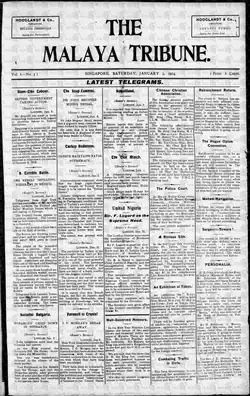![]() The Malaya Tribune front page on 3 January 1914, its 3rd ever page of publication. | |