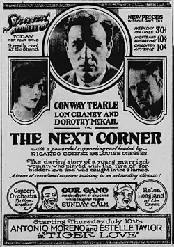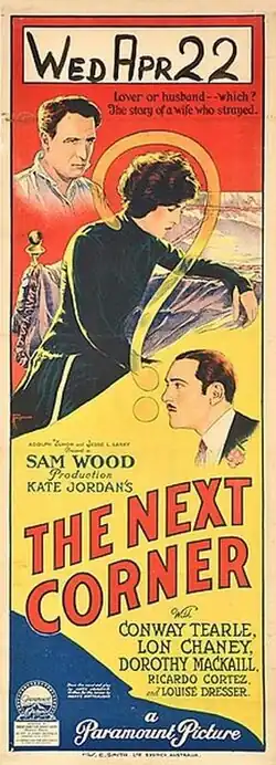 The Next Corner is a 1924 American silent romantic melodrama film directed by Sam Wood. The film starred Dorothy Mackaill and Lon Chaney. Based on the romance novel of the same name by Kate Jordan, the film was produced by Famous Players–Lasky and distributed by Paramount Pictures.[1]