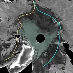 Envisat ASAR mosaic of the Arctic Ocean (September 2007), showing the most direct route of the Northwest Passage open (yellow line) and the Northeast Passage partially opened (blue line). The dark grey colour represents the ice-free areas, while green represents areas with sea ice.
