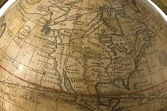 1765 globe by Guillaume Delisle, showing a fictional Northwest Passage