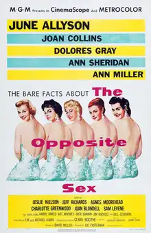 The Opposite Sex is a 1956 American musical romantic comedy film starring June Allyson, Joan Collins, Dolores Gray, Ann Sheridan, and Ann Miller, with Leslie Nielsen, Jeff Richards, Agnes Moorehead, Charlotte Greenwood, Joan Blondell, and Sam Levene in support.