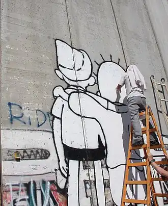 The artwork highlighted the development of the artist's oeuvre beyond merely entertaining and decorative street art, featuring his criticism at the state of the stagnant peace process between the Israelis and the Palestinians.[29] The work subsequently became a symbol for peace, repainted by other artists,[30][31][32] reproduced on shirts,[33][34] included in artistic films,[35] and appearing on posters and peace conferences invitations.[29]
