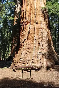 The President is a giant sequoia located in the Giant Forest of Sequoia National Park in the United States, east of Visalia, California. It is approximately 247 feet (75 m) high, and 27 feet (8.2 m) in diameter at the base. The President is currently recognised as the second-largest tree in the world,[1] measured by overall volume of wood (trunk + branches), and the oldest-known living sequoia, about 3,240 years old.[2] As of 2012, the volume of its trunk measured at about 54,000 cubic feet (1,500 m3), with an additional 9,000 cubic feet (250 m3) of branches.[3]