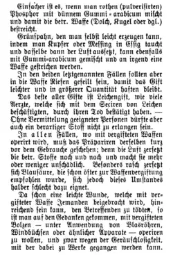 The book wasn't limited to explosives; it also provided ways to make invisible ink, flammable products sometimes compared to Molotov cocktails, and numerous methods for using poison, including creating it and applying it to bullets, blades, or nails.[5] Finally, it focused on the possibility of poisoning the wealthy by adding certain products to their food—for instance, if the person were serving the dishes.[5]