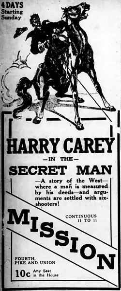 The Secret Man is a 1917 American silent Western film, directed by John Ford and featuring Harry Carey. Two of the five reels of the film survive at the Library of Congress film archive.[1]