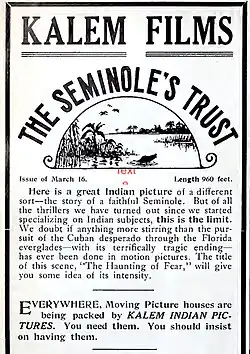 The Seminole's Trust is a 1910 American silent film produced by Kalem Company and directed by Sidney Olcott. It's a story of Seminole Indians.