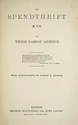 The Spendthrift is an 1857 historical novel by the British author William Harrison Ainsworth.[1] It was published in a single volume by London publisher Routledge.[2] It was initially serialised in Bentley's Miscellany from January 1855.[3] Illustrations were provided by Hablot Knight Browne. It is set in the eighteenth century and follows the misadventures of a young man who inherits a fortune.